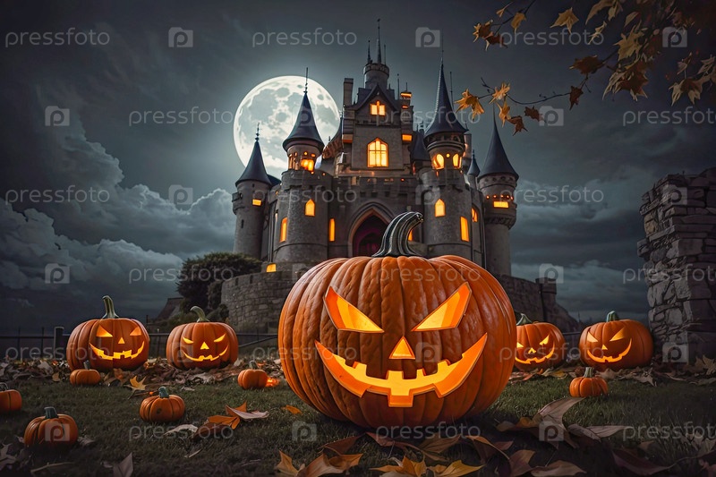 Хэллоуинская тыква, освещенная фонарем Джека ночью в лесу, летучие мыши, призрачный замок.Эта фотография была создана с помощью Leonardo AI