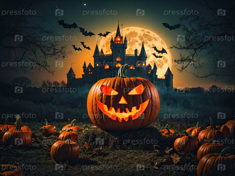 Голубь Хэллоуина, светящийся фонарь Джека ночью в лесу, летучие мыши, призрачный замок.Эта фотография была создана с помощью Leonardo AI
