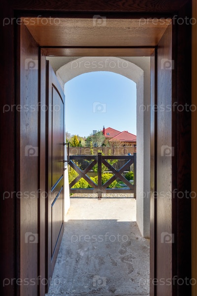 Небольшая прихожая с деревянной входной дверью, ламинатом и видом на зелень