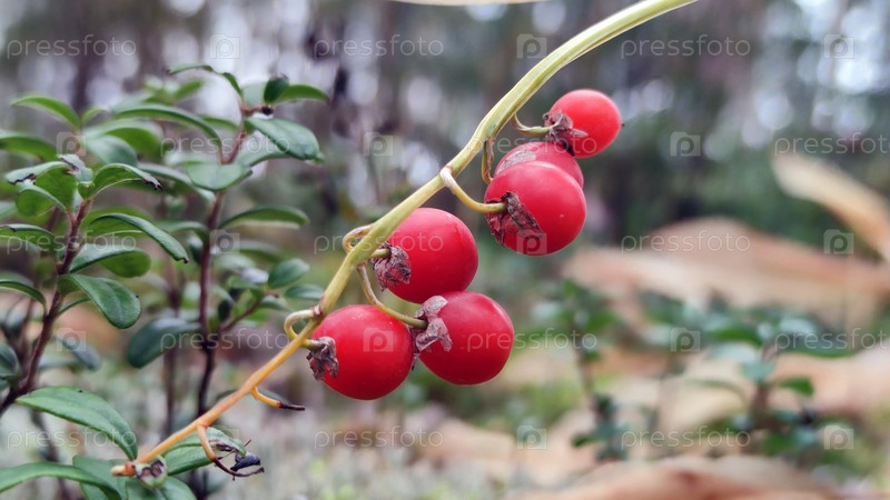 Красные ягоды лесного ландыша. В сосновом лесу ландыши выросли, отцвели, и на ветке появились красные ядовитые ягоды. У ландыша пожелтели листья и стебель