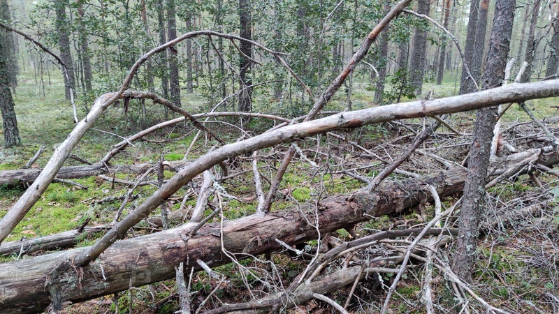 Хвойный лес в летний день. Растут сосны разного возраста и размера, у них коричневые стволы и разветвленная крона с зеленой хвоей. Внизу растет светло-зеленый лишайник, вереск, клюква