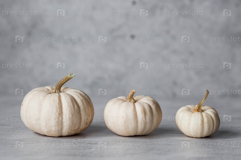 Сезонная осенняя еда. Свежие тыквы на сером бетонном фоне. Богатый урожай дынь