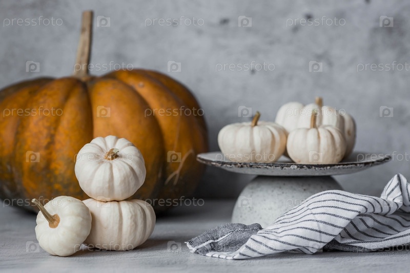 Сезонная осенняя еда. Свежие тыквы на стильной керамической тарелке на сером бетонном фоне. Богатый урожай дынь
