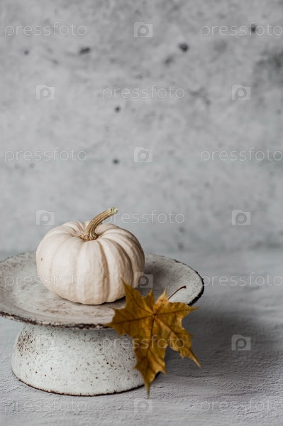 Сезонная осенняя еда. Свежие тыквы на стильной керамической тарелке на сером бетонном фоне. Богатый урожай дынь