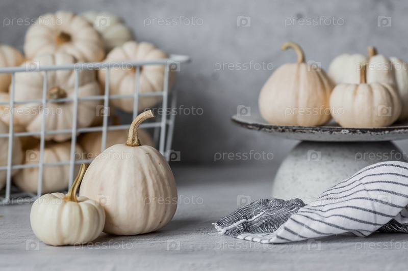 Сезонная осенняя еда. Свежие тыквы на стильной керамической тарелке на сером бетонном фоне. Богатый урожай дынь