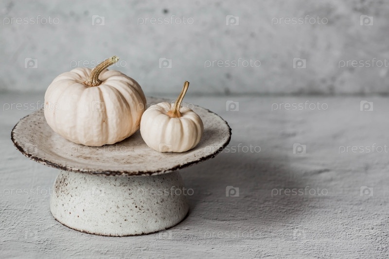 Сезонная осенняя еда. Свежие тыквы на стильной керамической тарелке на сером бетонном фоне. Богатый урожай дынь