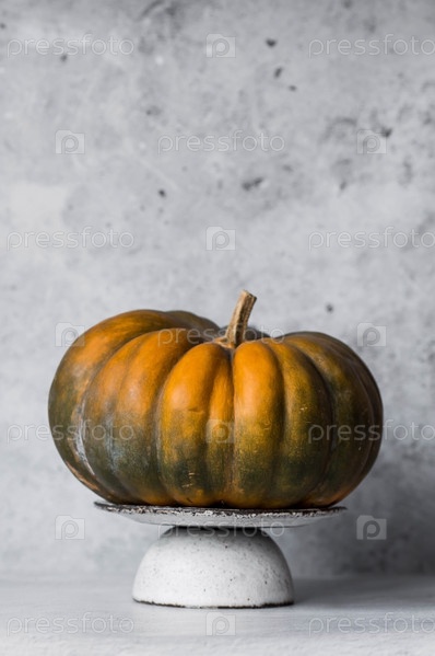 Сезонная осенняя еда. Свежие тыквы на стильной керамической тарелке на сером бетонном фоне. Богатый урожай дынь