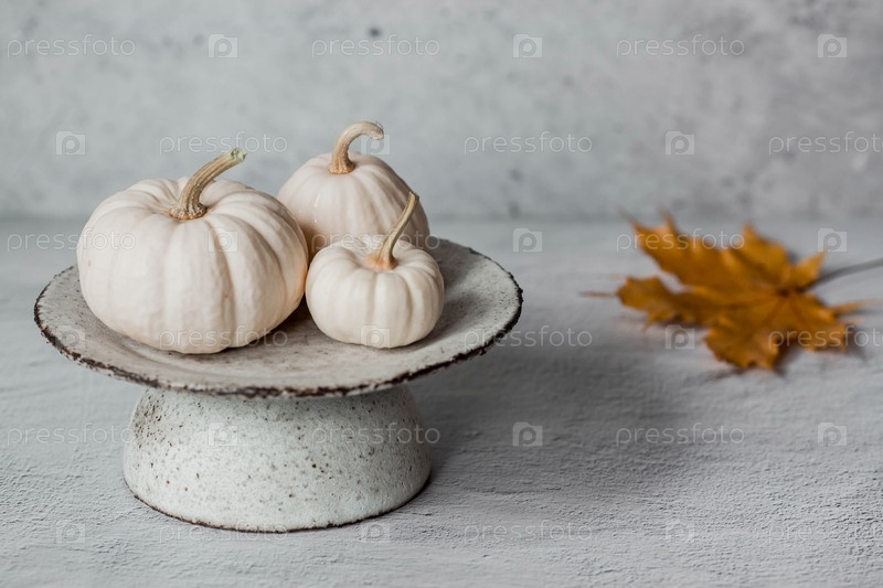 Сезонная осенняя еда. Свежие тыквы на стильной керамической тарелке на сером бетонном фоне. Богатый урожай дынь