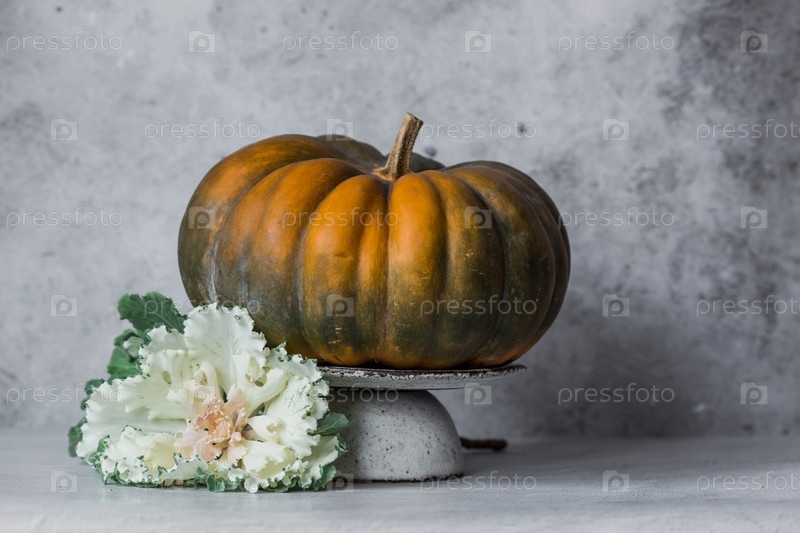 Сезонная осенняя еда. Свежие тыквы и декоративная капуста на сером бетонном фоне. Богатый урожай дынь