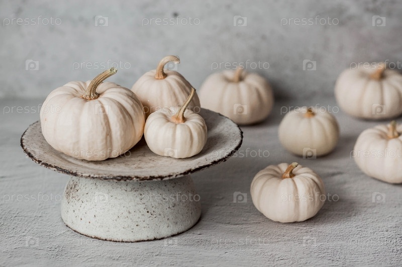 Сезонная осенняя еда. Свежие тыквы на стильной керамической тарелке на сером бетонном фоне. Богатый урожай дынь