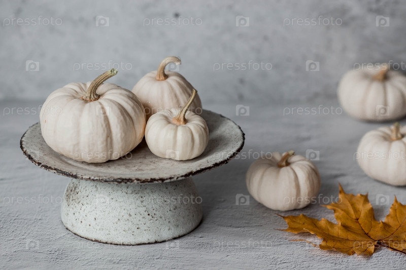 Сезонная осенняя еда. Свежие тыквы на стильной керамической тарелке на сером бетонном фоне. Богатый урожай дынь