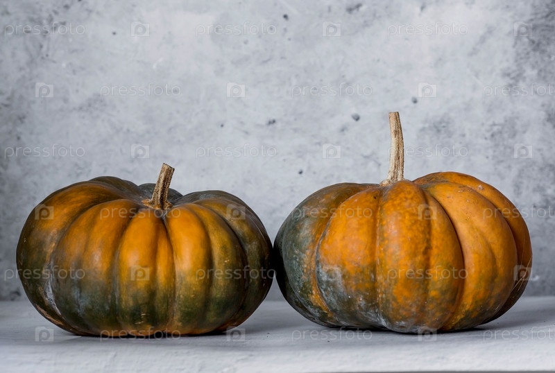 Сезонная осенняя еда. Свежие тыквы на сером бетонном фоне. Богатый урожай дынь