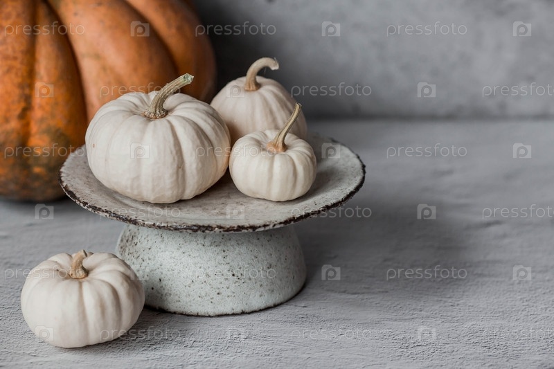 Сезонная осенняя еда. Свежие тыквы на стильной керамической тарелке на сером бетонном фоне. Богатый урожай дынь