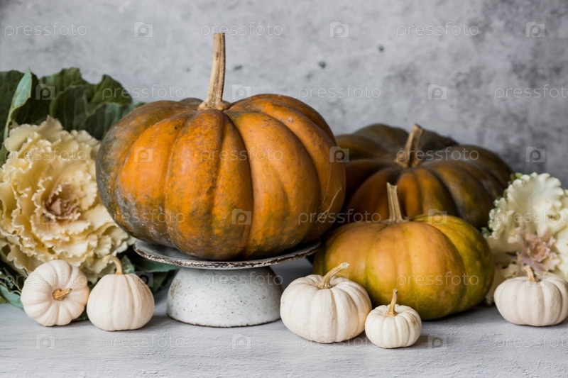 Сезонная осенняя еда. Свежие тыквы и декоративная капуста на сером бетонном фоне. Богатый урожай дынь