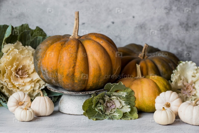 Сезонная осенняя еда. Свежие тыквы и декоративная капуста на сером бетонном фоне. Богатый урожай дынь