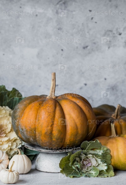 Сезонная осенняя еда. Свежие тыквы и декоративная капуста на сером бетонном фоне. Богатый урожай дынь