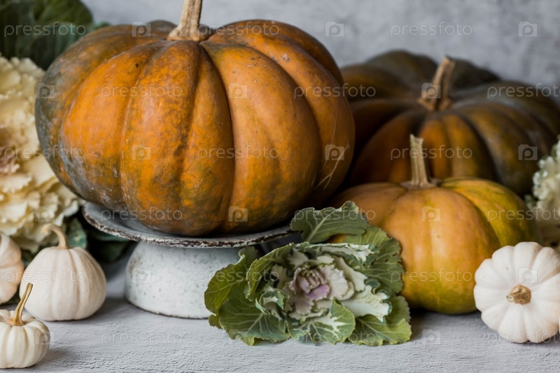 Сезонная осенняя еда. Свежие тыквы и декоративная капуста на сером бетонном фоне. Богатый урожай дынь