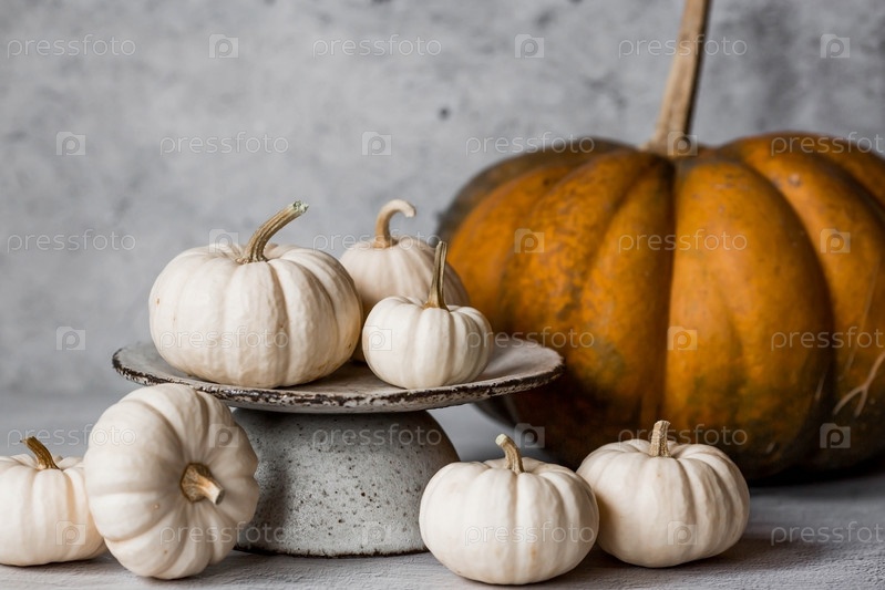 Сезонная осенняя еда. Свежие тыквы на стильной керамической тарелке на сером бетонном фоне. Богатый урожай дынь