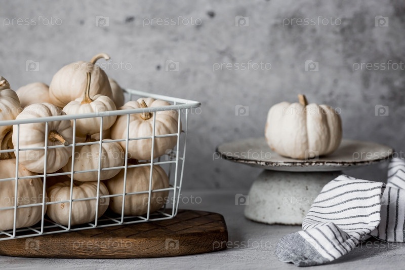 Сезонная осенняя еда. Свежие тыквы на сером бетонном фоне. Богатый урожай дынь