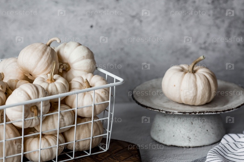 Сезонная осенняя еда. Свежие тыквы на сером бетонном фоне. Богатый урожай дынь