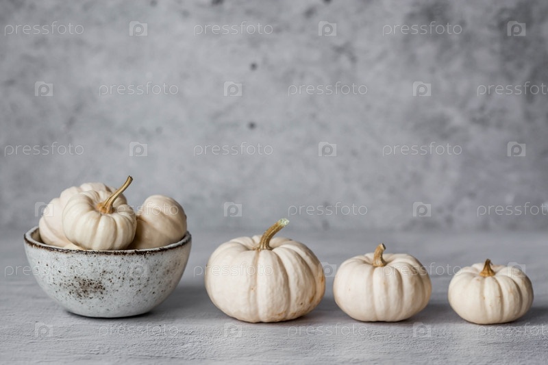 Сезонная осенняя еда. Свежие тыквы на стильной керамической тарелке на сером бетонном фоне. Богатый урожай дынь