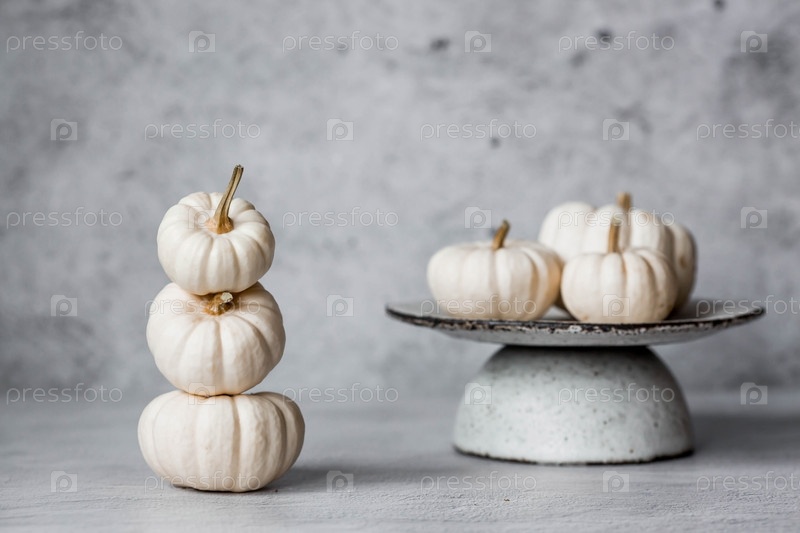 Сезонная осенняя еда. Свежие тыквы на стильной керамической тарелке на сером бетонном фоне. Богатый урожай дынь