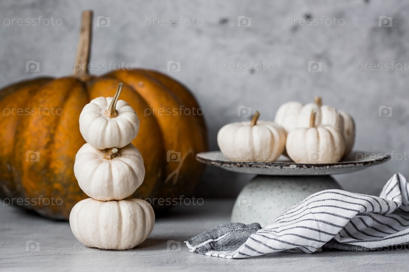 Сезонная осенняя еда. Свежие тыквы на стильной керамической тарелке на сером бетонном фоне. Богатый урожай дынь