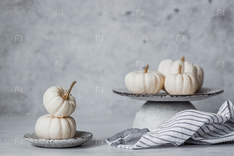 Сезонная осенняя еда. Свежие тыквы на стильной керамической тарелке на сером бетонном фоне. Богатый урожай дынь