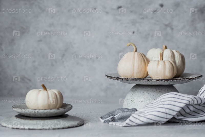 Сезонная осенняя еда. Свежие тыквы на стильной керамической тарелке на сером бетонном фоне. Богатый урожай дынь