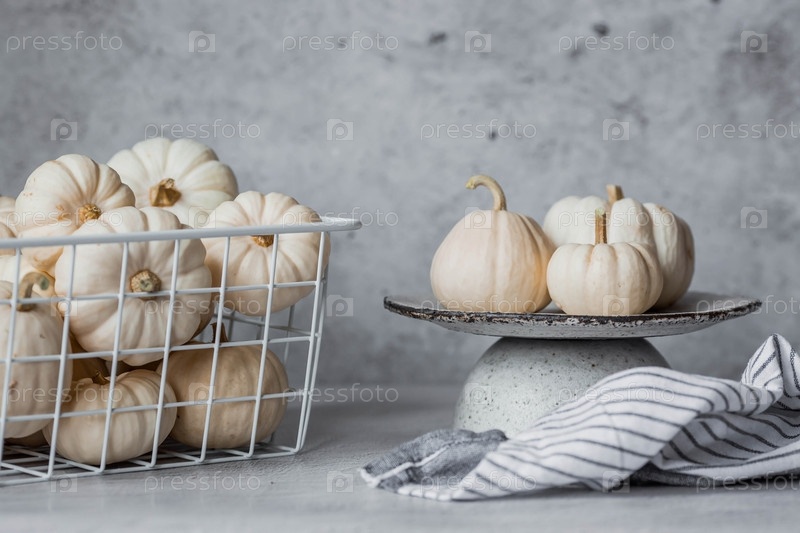 Сезонная осенняя еда. Свежие тыквы на стильной керамической тарелке на сером бетонном фоне. Богатый урожай дынь