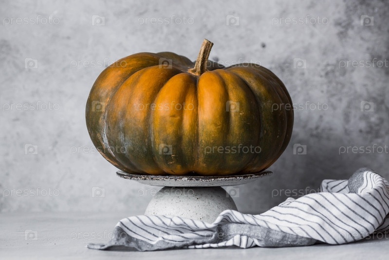 Сезонная осенняя еда. Свежие тыквы на стильной керамической тарелке на сером бетонном фоне. Богатый урожай дынь