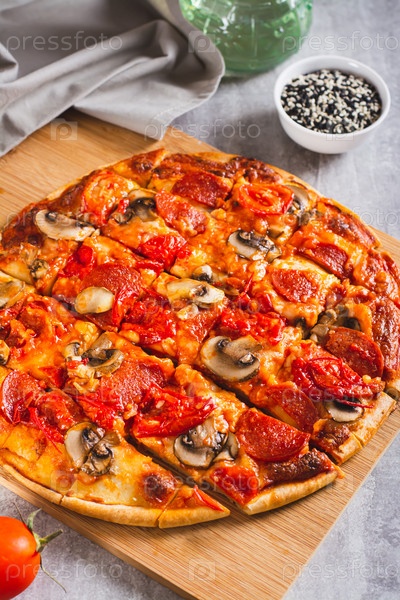 Американская пицца в стиле Сент-Луиса с беконом, грибами и помидорами на доске, вертикальный вид