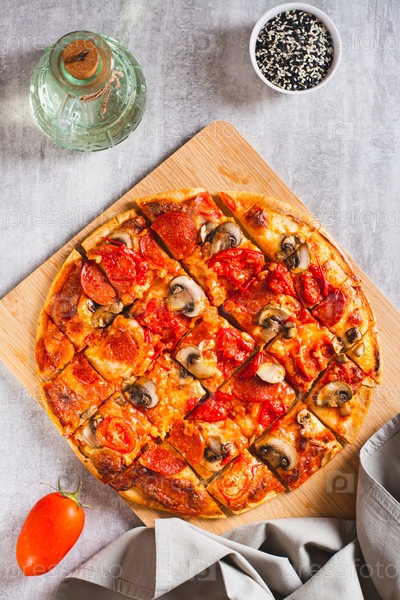 Пицца в американском стиле Сент-Луиса с беконом, грибами и помидорами на доске и вертикальным видом