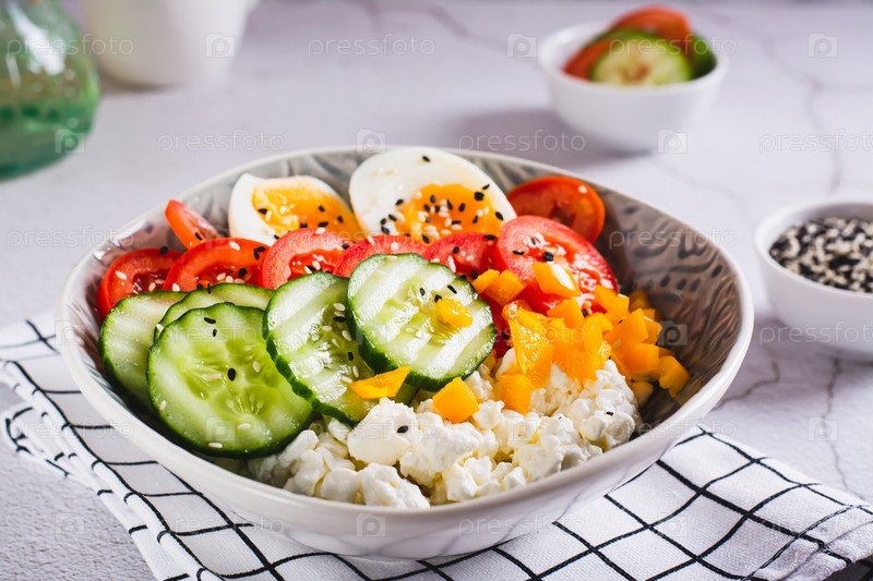 Чаша творога с помидорами, огурцом, перцем и яйцом на столе
