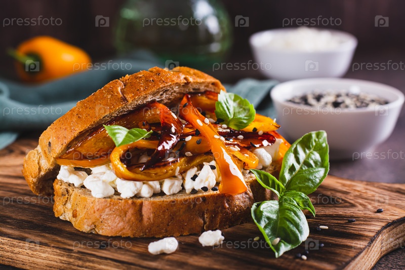 Сэндвич с рикоттой, запеченным болгарским перцем и кунжутом на доске