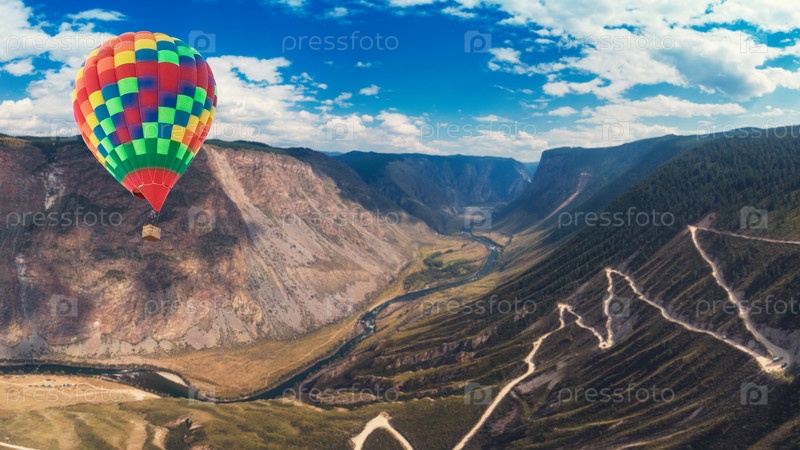 Воздушный шар над перевалом Кату Ярык и долиной реки Чулышман. Республика Алтай, Россия, прекрасный летний день