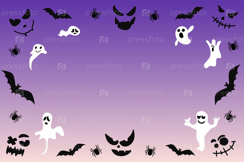 Праздничный фон. Счастливый баннер Хэллоуина. Иллюстрация с летучими мышами, привидениями и пауками