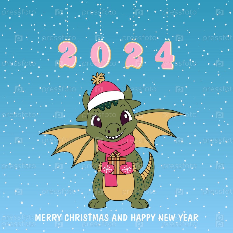Рождественская открытка с милым зеленым драконом-символом 2024 года. Забавный зеленый дракон с подарком. Открытка с Рождеством и Новым годом. Вектор. Векторная иллюстрация