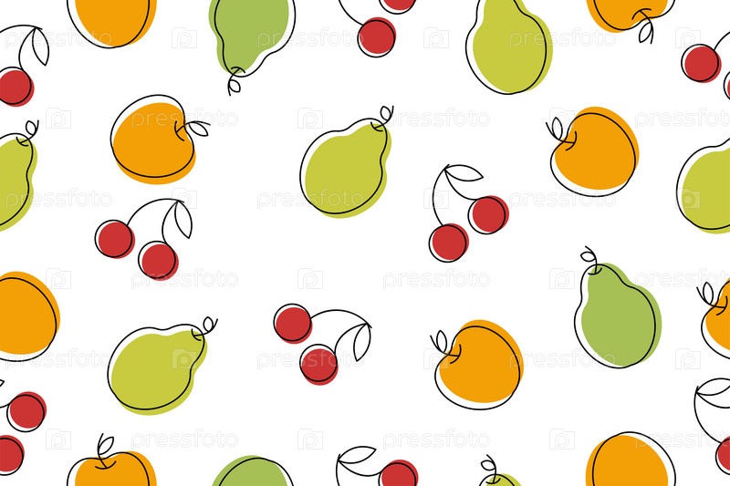 Фруктовый узор. Бесшовный узор с вишней, яблоком, сливой, грушей. Красочный узор. Векторная иллюстрация