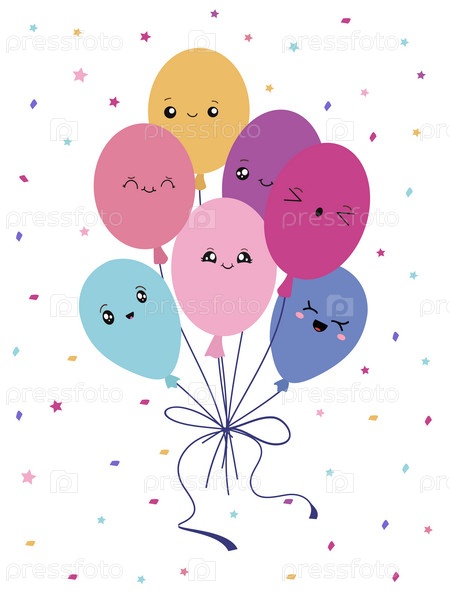 Открытка с воздушными шарами в стиле каваи, милые мультяшные воздушные шары. Векторная иллюстрация