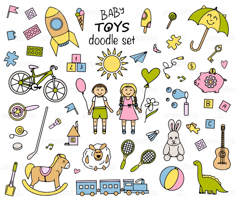 Набор детских игрушек и спортивного инвентаря. Яркие игрушки в стиле каракулей. Векторная иллюстрация. Вектор