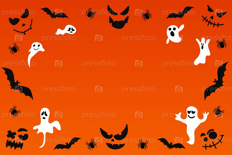 Праздничный фон. Счастливый баннер Хэллоуина. Иллюстрация с летучими мышами, привидениями и пауками