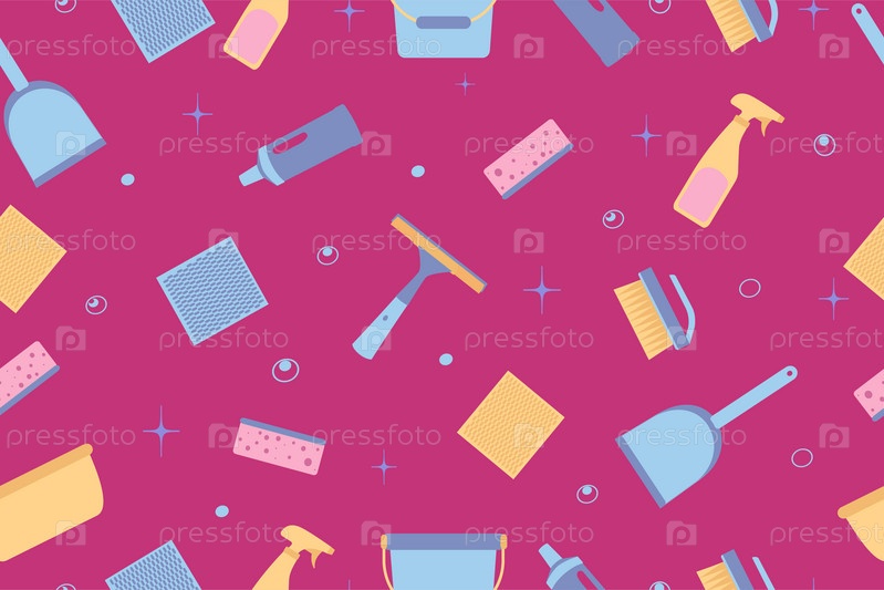Бесшовный рисунок из комплекта чистящего оборудования. Векторная иллюстрация изолирована на розовом фоне. Векторная иллюстрация