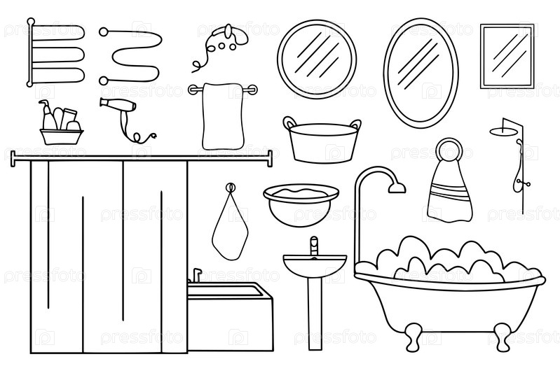 Набор рисованной иконок для ванной и туалета. Коллекция аксессуаров для ванной комнаты. Векторная иллюстрация
