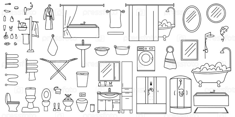 Набор рисованной иконок для ванной и туалета. Коллекция аксессуаров для ванной комнаты. Векторная иллюстрация