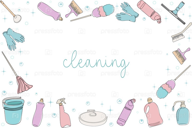 Фон чистящего оборудования. Векторная иллюстрация изолирована на белом фоне. Чистящие средства в одной линии