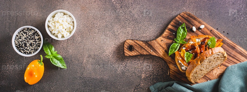 Брускетта с творогом, печеным перцем и кунжутом на доске, вид сверху веб-баннер