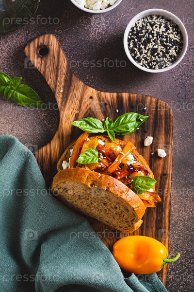 Брускетта с творогом, запеченным перцем и кунжутом на доске и вертикальный вид