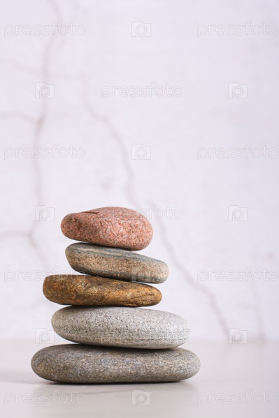 Пирамида из гладких морских камней на столе на фоне оштукатуренной стены, вертикальный вид