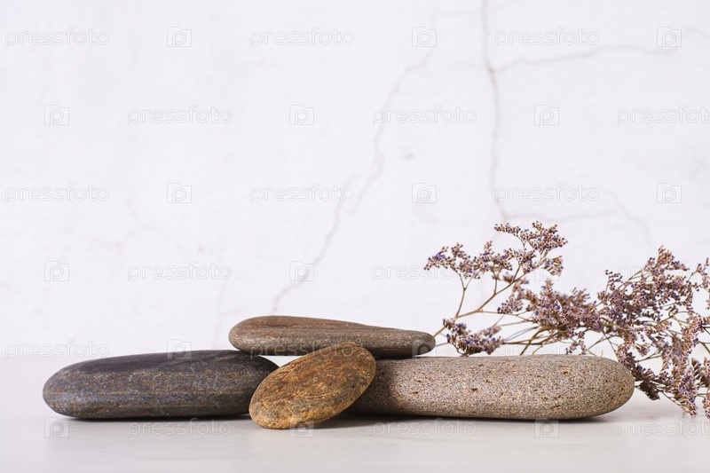 Узор из гладких плоских морских камней и сухих цветов на столе для копирования